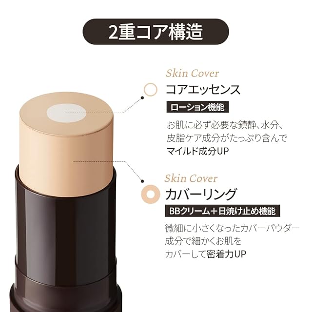 2重コア構造でコアエッセンス(ローション)+カバーリング(ファンデーション+日焼け止め)でマイルド成分UP、密着力UP