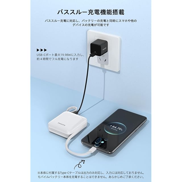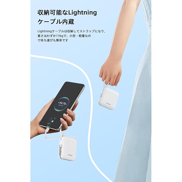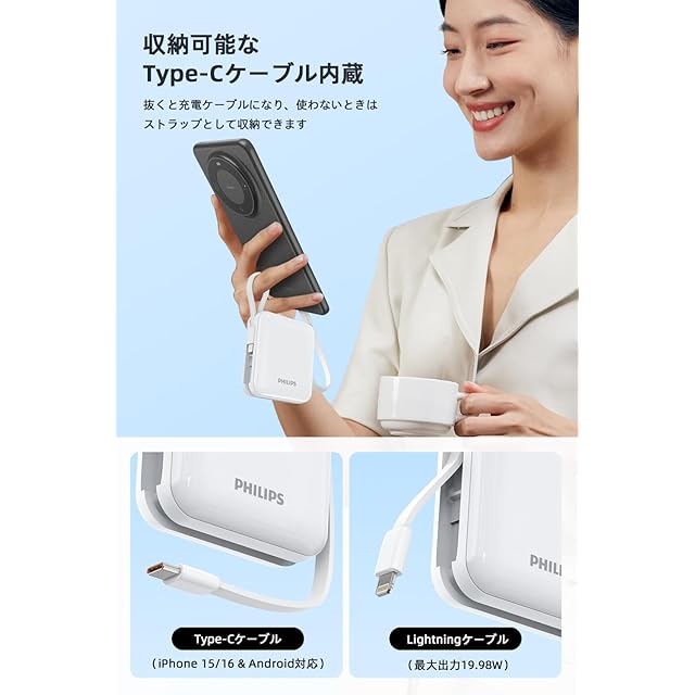 Philips (フィリップス) モバイルバッテリー 10000mAh 大容量 小型 携帯充電器 Lightning type-c ケーブル内蔵 PD 22.5W 急速充電 4台同時充電 スマホ 持ち運び iPhone 16 / 15 Android iPad 各種機器対応 PSE認証済 ホワイト DLP5713CW