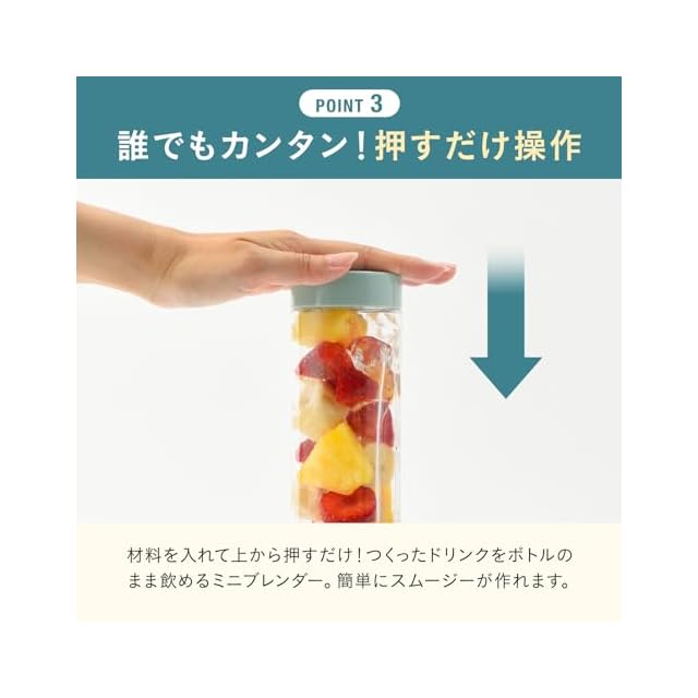 "材料を入れて上から押すだけ!つくったドリンクをボトルのまま飲めるミニブレンダー。 フタをすれば保存や持ち歩きもでき、忙しい毎日でもスムージー習慣が気軽に続けられます。 飲みきりにちょうどいい280mL容量で、ひとり分を無理なく無駄なくつくることができます。"