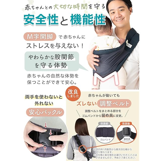 【大切な赤ちゃんに使うものだから安心設計】・M字開脚で赤ちゃんにストレスを与えません ・バックルは安心の2重ロック ・肩パッドとサイドクッションはコットン100%で敏感な赤ちゃんの肌に触れても安心です ・メッシュ部分は抜群の通気性であせも対策にも 【手軽に使えるポイント】・使う人の身体に合わせて簡単調整!・厚さ2cmの肩パッドで疲れにくい・便利な収納ポケット・丸洗いOKで清潔