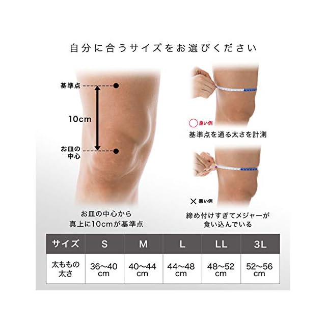 【ヒザに的確フィット、圧迫力も調節自在】正面のアジャスタブル面ファスナーで、ヒザ・太ももの形状に的確にフィット。圧迫力の調節も自在です。