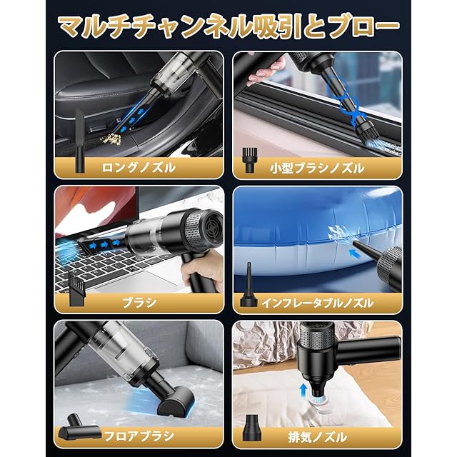 【多機能4-in-1車用掃除機】✅吹き飛ぶ✅ 吸い込む ✅空気入れ ✅空気抜き 交換可能なノズルが付属しています。コンパクトで軽量なので、車内に置いてもホコリやゴミを効果的に掃除できます。また、屋外での使用にも適しており、浮き輪や風船、エアマットレスへの充填にも使用できます。ご家庭では、ソファ、マットレス、窓、キーボードのコーナーなどのホコリやゴミを効果的に掃除できる多機能ポータブルフーバーです。