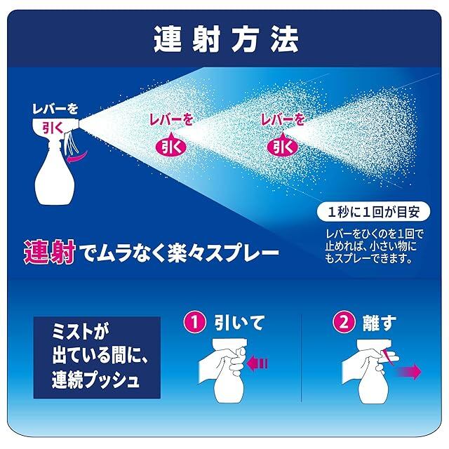 ワイドに広がるスプレーで大きいアイテムにも楽々スプレー可能。ベッドやカーペット、ソファへの使用がおすすめ。