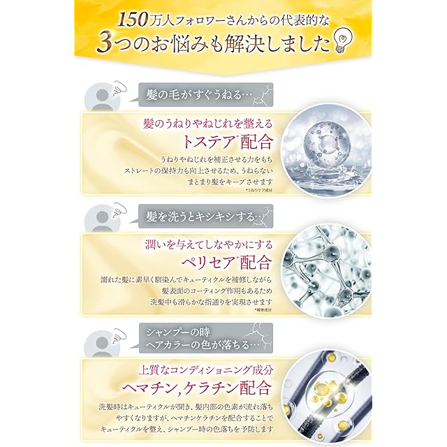 ✅【豊富な保湿成分】加水分解コラーゲンやパンテノールなど豊富な保湿成分を配合。しっとりと柔らかい髪をキープさせることで、パサつきを軽減させツヤのある美しい髪に仕上げます。