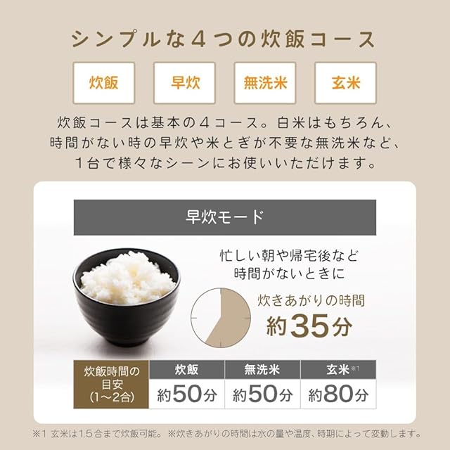炊飯コースはベーシックな4つのコース搭載。 白米はもちろん、時間がない時に早炊きや米とぎ不要な無洗米など、1台で様々シーンにお使いいただけます。
