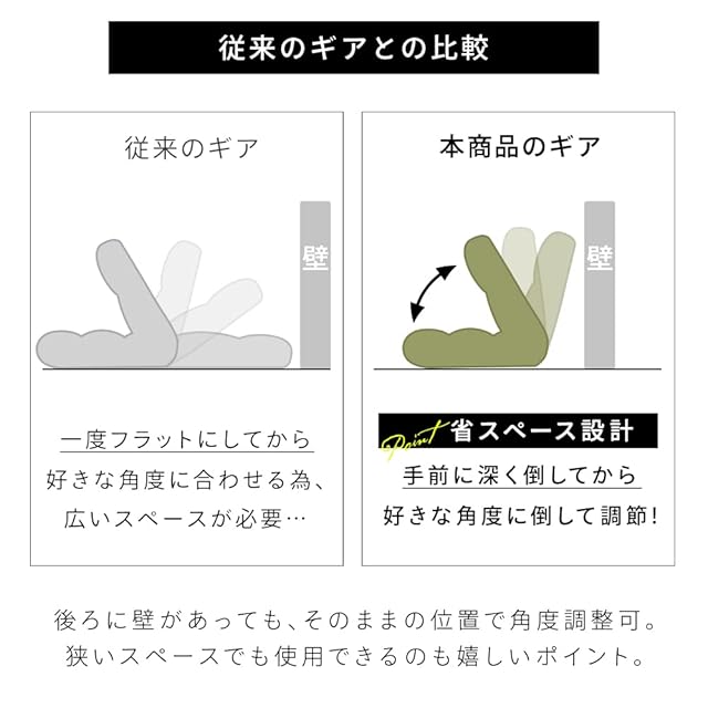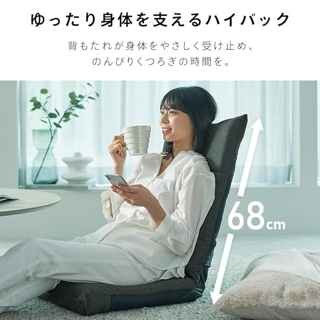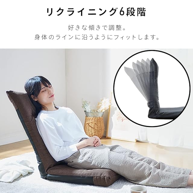 背もたれ6段階リクライニング。心地良い角度に調節できます。長時間座っても快適な座り心地。背中やお尻、身体に沿うようにフィットします。