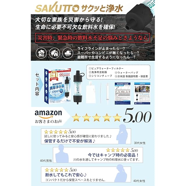 【防災士&登山プロガイドが推奨】地震や津波などの非常時には、飲料水の確保がもっとも重要とされています。とはいえ、川やため池の水、お風呂の残り水などを除菌せずそのまま飲むと体調不良の原因となります。そんな時に、SAKUTTO 携帯ろ過機があれば、本体内部の特殊構造が(大腸菌、コレラ菌などの細菌や原虫嚢子)をしっかり除去して、安心安全で清潔な飲料水へとろ過してくれます。自然災害は急にやってきます。防災グッズとして早め早めに備蓄しておく事を防災士が推奨しています。