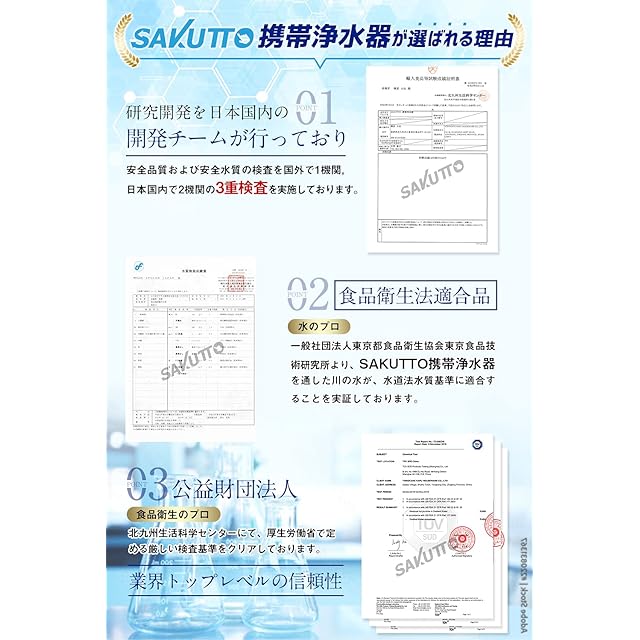 【日本企業が企画・開発・管理】最高水準の除去率99.99999%を国内の水質検査機関にて実証しているSAKUTTO 携帯ろ過器は、日本企業が企画・開発・管理を行っており、商品ひとつひとつに丁寧な管理、検査を徹底して行なっております。さらに日本語説明書・保証書も付属しており、日本企業ならではの180日間のメーカー保証制度も付帯しておりますので、ご安心してお試しくださいませ。