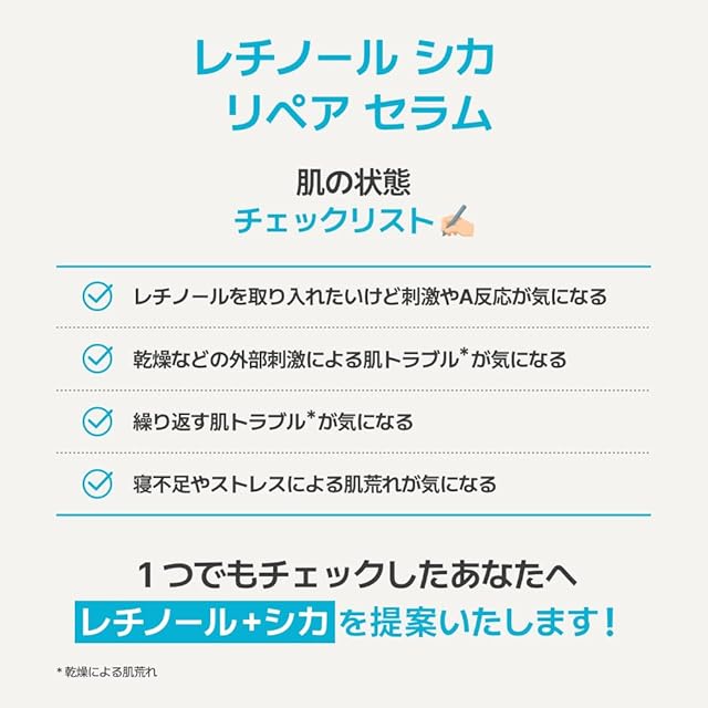 【肌に優しく簡単なレチノール使用方法】 美容液の使用前後、しっかり保湿ケアをすること! レチノール使用後、日焼け止めを塗ること!(朝使う場合) レチノール初心者なら塗る前に少量でパッチテストから試してみること! 揺らぎ肌が気になる時、少量のみ塗ったり、使用を中止すること!