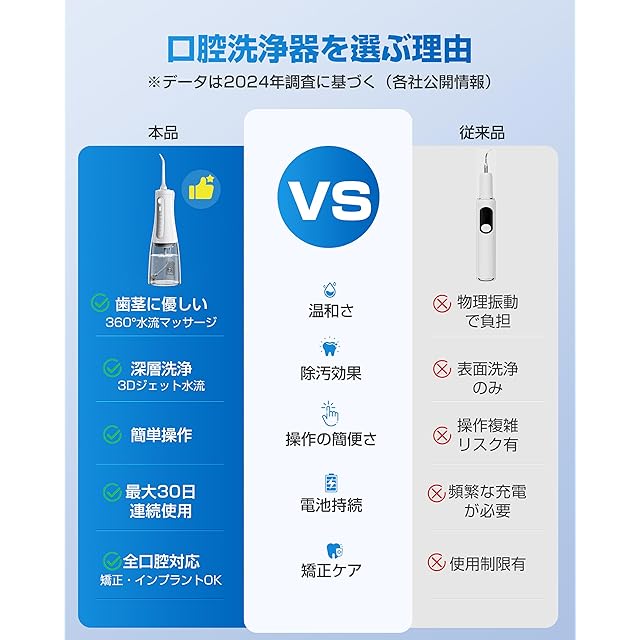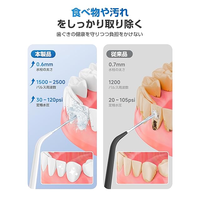 【強力な水流・深層洗浄】 歯ブラシによるブラッシングでは丁寧に磨いても5割ほどしか汚れを除去できません。この高圧ジェットウォッシャーは、30-150psiの水圧と1500-2500回/minの脈動頻度を実現しています。毎日歯間ケアを行うことで、従来の歯ブラシでは届かない部分まで徹底的に清掃できます。特に歯間や矯正器具の周りの汚れを効果的に取り除き、健康な口腔環境を維持します。頑固なバイ菌や食べかすを洗い流し、清潔感を与えます。