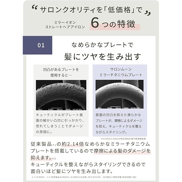 ✅【 ミラーチタニウムプレートを採用 】高級機並みのクオリティの ヘアアイロン を格安でご提供できるのが SALONMOON ( サロンムーン )の強みです。滑らかな チタン 素材の プレート を採用。ツヤとまとまりのある美しい ストレート ヘア を簡単に作ることができる、こだわりの ストレートヘアアイロン です。短時間で ストレート カール などのスタイルが決まるので 髪が 痛みくい のも嬉しいポイント。