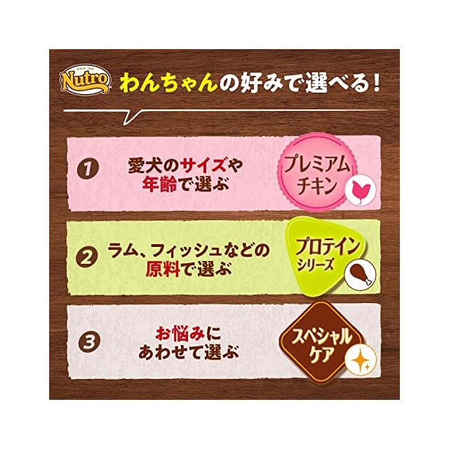 ニュートロナチュラルチョイスは、高品質な自然素材を使用し、愛犬の様々なニーズにこたえるナチュラル※フードです。(※栄養強化のため、合成ビタミン、ミネラル、アミノ酸使用) 体のサイズやライフステージ、ライフスタイル、ダイエットなどのお悩みなど、愛犬のニーズに合わせて選べる食事です。