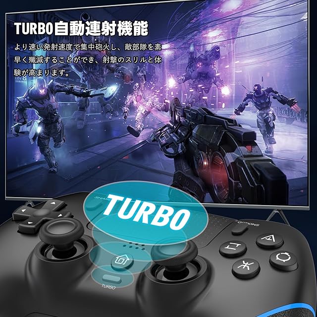 【二重振動&Turbo連射機能】6軸ジャイロセンサーと振動モーターを搭載しており、敵の攻撃を受けた瞬間に反応しますので、反撃や対策がしやすくなります。内蔵振動モーター、ゲーム中に敵の攻撃を受けたなど場合に、コントローラーはそれに応じて従来よりも緻密な振動を提供します。TURBO自動連射機能は自由に設定でき、TURBOボタンと設定したいボタンを同時に押して手動連射となり、再度押すと自動連射となり、3回目に押すと連射が解除される。格闘系ゲームなら、ぜひこの連射機能を利用して、勝率を上げましょう!