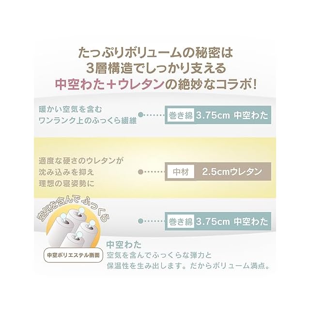 体を支えるウレタンを、肌触りのいい柔らかい巻綿で包んだボリュームのある三層構造