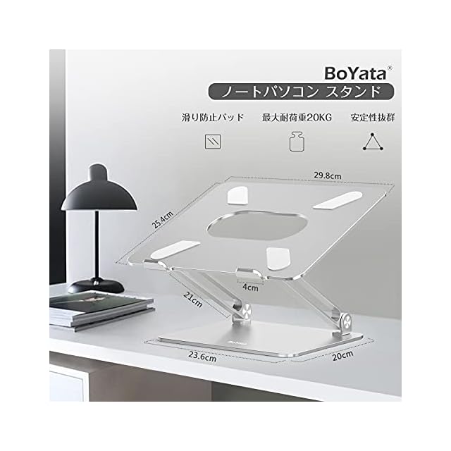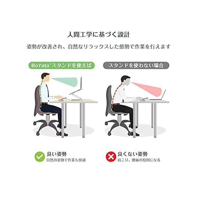 【無段階角度・高さ調整可能】●人間工学に基づいて設計により、PC作業時、角度・高度を無段階調整可能で自分に最適な高度まで調整できるパソコンスタンド!●デスクが低いためデスクワークの際に腰に負担がかかってしまっていたが、Boyataスタンドを使うことによってパソコンを目線と同じ高さにする事で背筋が伸び、猫背などを有効に防止、背中が丸まりにくくなって、リモートワーク時代の必需品 !!