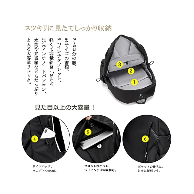 【軽量で大容量/USB充電ポート】収納力は十分にあり。A4サイズ、PC、教科書、傘、衣類、飲み物、お弁当、重い荷物を入れても安心感あり。通学や通勤や旅行や出張などにおすすめです。※バックパックの側面にUSB充電ポートあり、お手元のスマトホンを充電できます、気楽に片手で携帯電話が使えます。