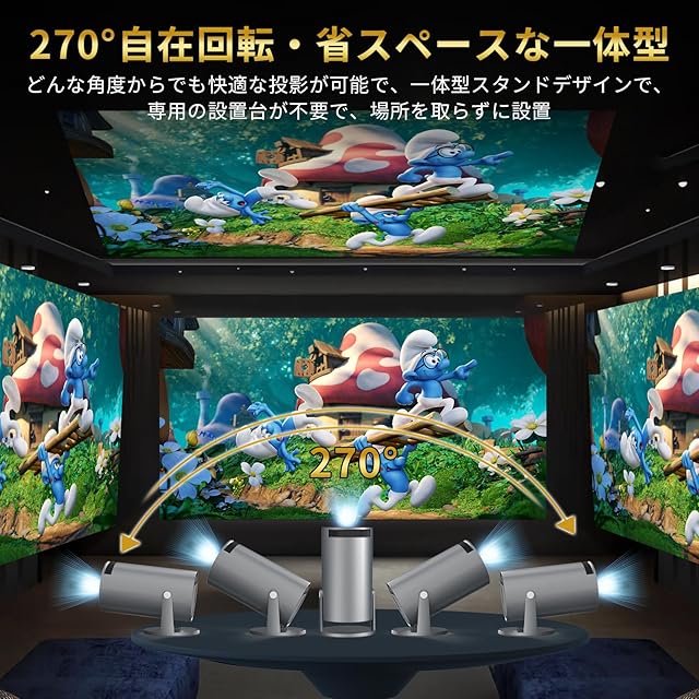 【270°回転スタンド&自動台形補正&天井投影も簡単】一体型スタンドの小型プロジェクターが270°回転するため、「天井 プロジェクター」としての設置もスムーズに行えます。三脚不要で壁や天井に直接投影でき、寝室でベッドの上で映画を楽しむことが可能です。自動台形補正機能と4面手動補正により、傾けて設置した場合でも瞬時に矩形画面に調整します。 0.5~3mの短距離投影で30~200インチの大画面を実現する「小型プロジェクター」ですが、設置の自由度は格段に高いです。狭い部屋でも大画面を楽しめるので、「プロジェクター 小型」を求めるユーザーにも最適です。